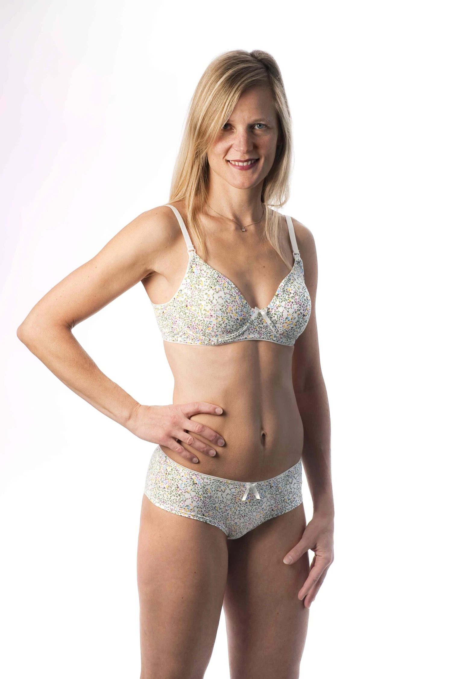 Ein wunderschöner Streublumendruck und ein herzförmiger Kristallanhänger machen dieses Ensemble zu einem unentbehrlichen Lieblingsstück jeder Stillzeit.
