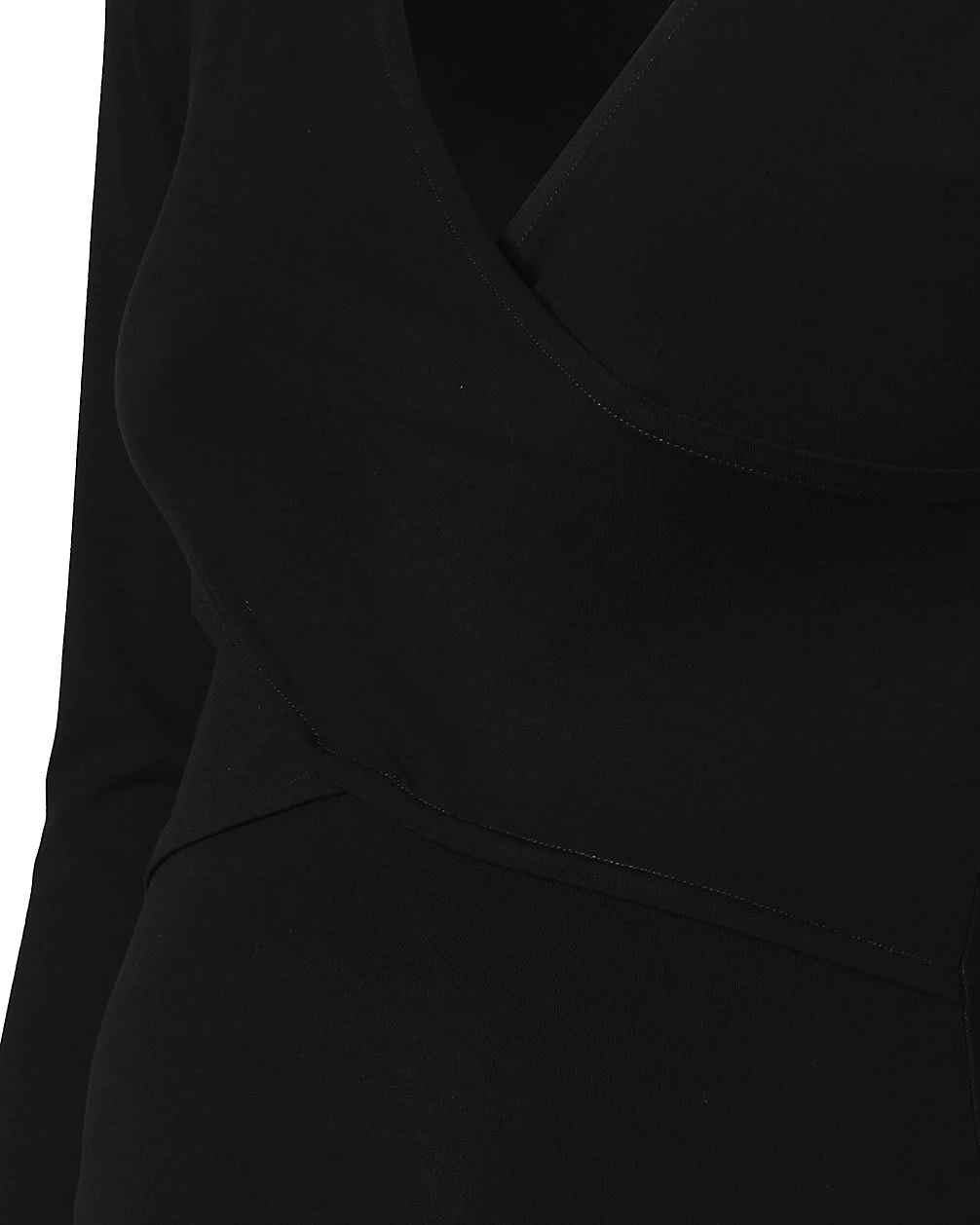 Das BEBEFIELD Umstandsshirt EVELINA bietet durch den Schnitt und das angenehme, elastische Material dem Bauch viel Platz. Durch das gewickelte Material im Brustbereich ist auch das Stillen kein Problem.