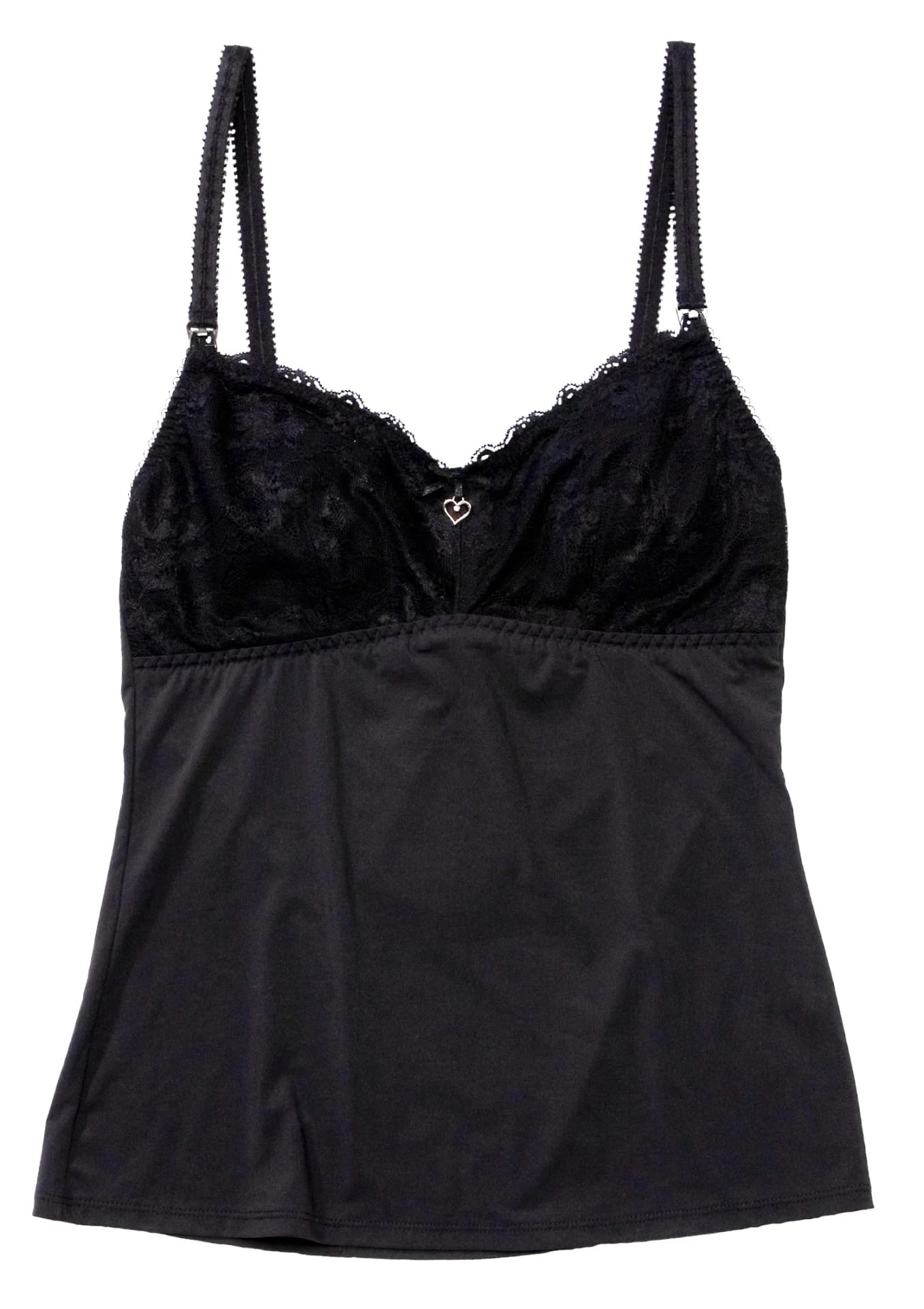 Das Still-Top „EMMA“ ist ein Hemdchen als Spaghettitop ohne Bügel aber mit gutem Halt durch innerem Bustier Einsatz. Es sitzt ideal wie ein Still-BH und liegt gut an: Die Körbchen sind komplett aus edler elastischer Spitze gefertigt und zusammen mit dem Herzchenanhänger als Blickfang und der blickdichten und unfassbar weichen Modalware entsteht ein edles Gesamtbild. Die Körbchen/Cups sind weich gefüttert und die Träger elastisch und breit genug, um nicht einzuschneiden und schmal genug, das filigrane Design nicht zu stören. Die raffinierte Schnittführung und die hochwertigen Materialien des Stilltops sorgen für optimalen Tragekomfort und maximalen Halt. Das Still-Top ist sehr leicht einhändig über einen Clip-Verschluss zu öffnen. Durch stufenlos verstellbare Schulterträger und dem Einsatz von sehr dehnbaren, weichen Materialien passt es sich sehr gut den sich verändernden Körpermaßen an .
