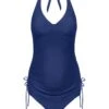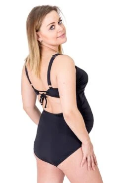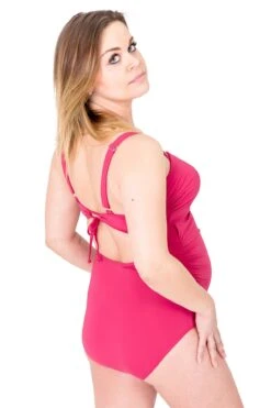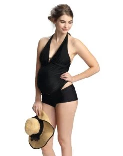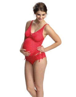 Das Tankinitop ist mit 3-fach verstellbarem Bügel-BH Teil innen ausgestattet und bietet durch weiche, breitere, verstellbare Träger ein sehr gutes Tragegefühl. Die Körbchen sind – leicht gepolstert – passend für größere Cupgrößen D und E entwickelt worden und geben optimalen Halt. Ein hochwertiges Silikontape liegt innen um die obere Kante und sorgt dafür, dass Nichts verrutscht. Die kunstvolle Raffung im Vorderteil ist individuell verstellbar durch den Tunnelzug. Der Bikinislip dieser Umstandsbademode ist stufenlos verstellbar durch zum Oberteil passende Bändchen. Er sitzt kess auf Hüfte und ist individuell anpassbar auf jede Figur. Das innovative, seidig schimmernde Material ist fein, weich, anschmiegsam und angenehm elastisch sowie schnell trocknend. Optimale Schnittführung, gute Passform und eine technisch modernste Verarbeitung runden das zeitgemäße Design ab, so dass er noch weit über die Schwangerschaft hinaus und auch von Nicht-Schwangeren gern getragen wird.