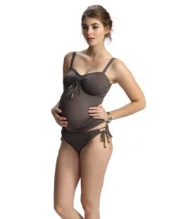 Unser Umstandstankini Bandeau-Top Cameron_solid in D- und E-Cup Größen kommt wunderbar zur Geltung in unserem neuen edel-matten feinen Material in einem wunderschönen Bronze-Nougat Ton und ist dezent dekoriert mit mattgold schimmernden Perlendetails.