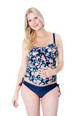 Unser Umstandstankini Bandeau-Top Cameron_multirose in F- und G-Cup Größen kommt wunderbar zur Geltung in unserem neuen edel-matten feinen Material in einem wunderschönen Rosendruck und ist dezent dekoriert mit pink-schimmernden Perlendetails.