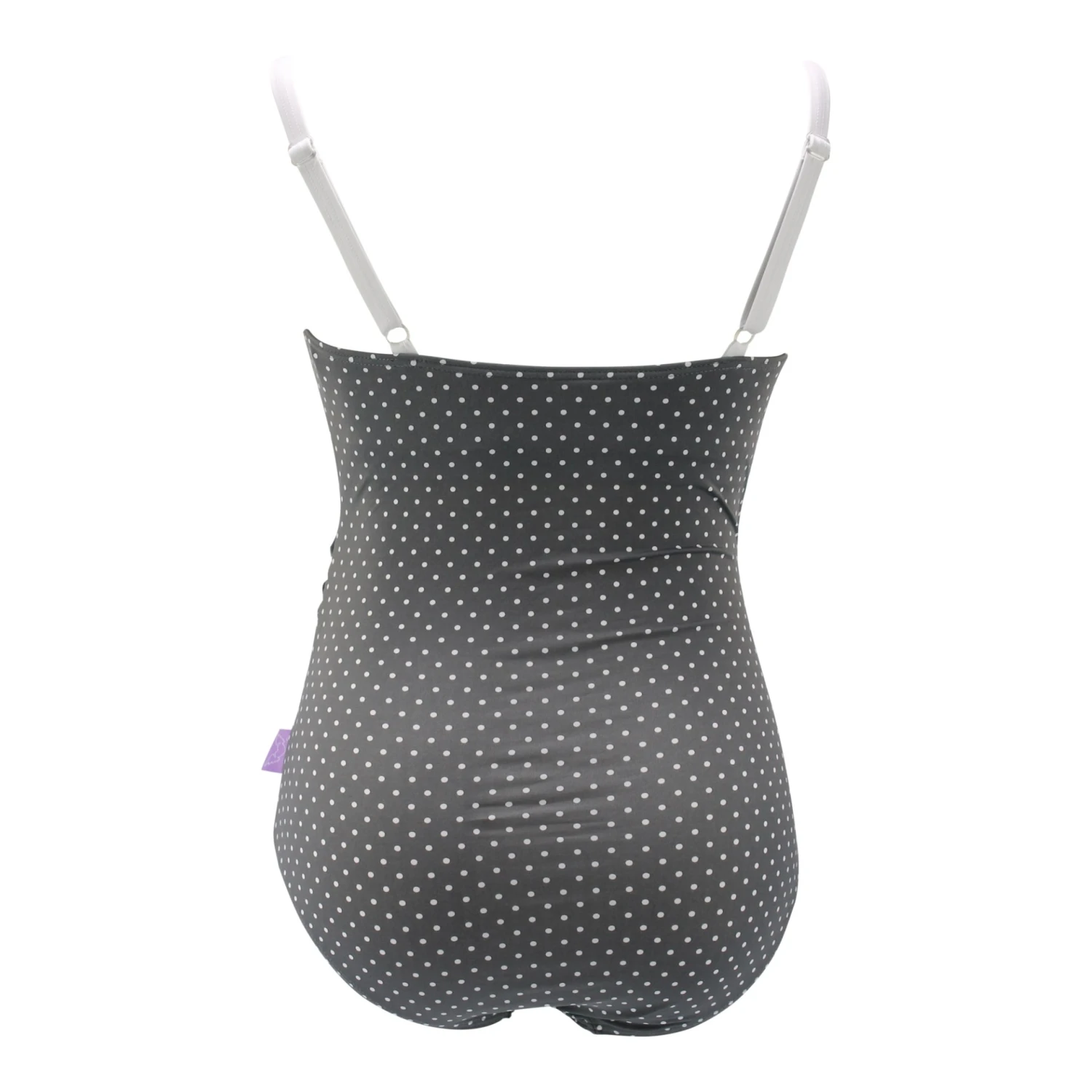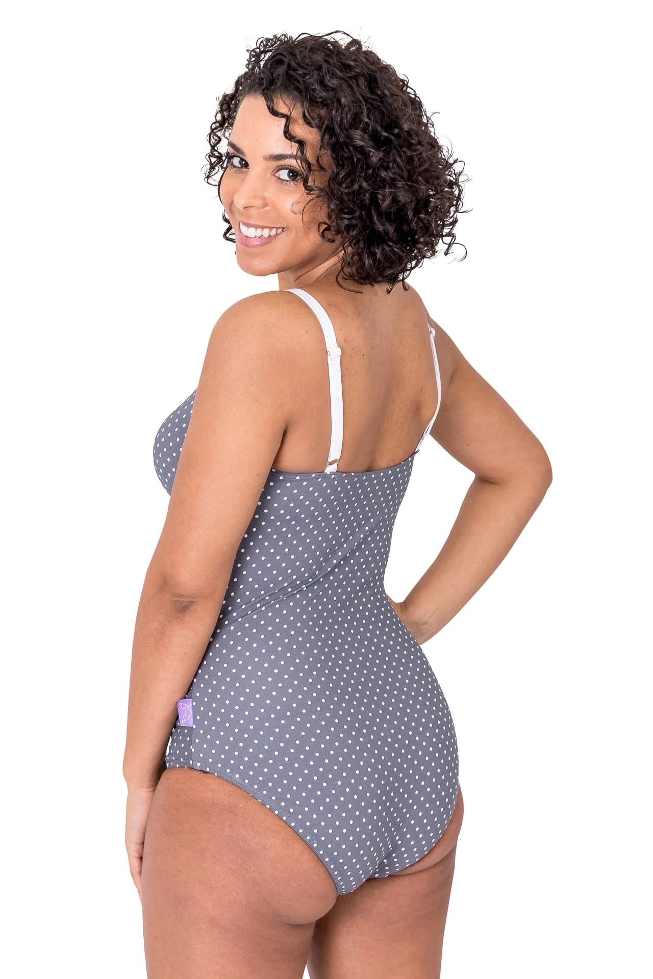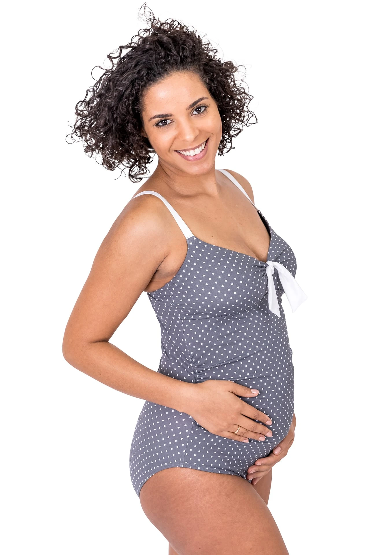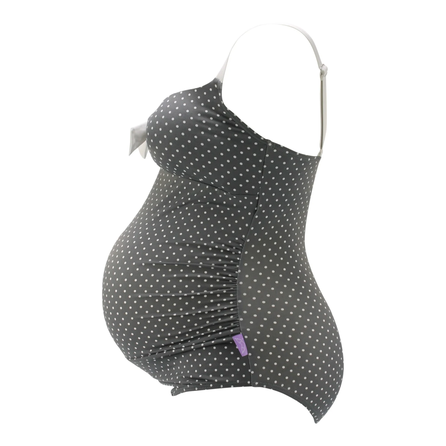 Umstandsbademode klassisch schön mit zarten weißen Details, so macht dieser Umstandsbadeanzug die Lust am Flanieren und die Vorfreude auf das Baby perfekt. Anspruchsvolles Design in Platingrau mit weißem Pünktchen passend für Körbchengrößen B C bis D Soft-Cups ohne Bügel.