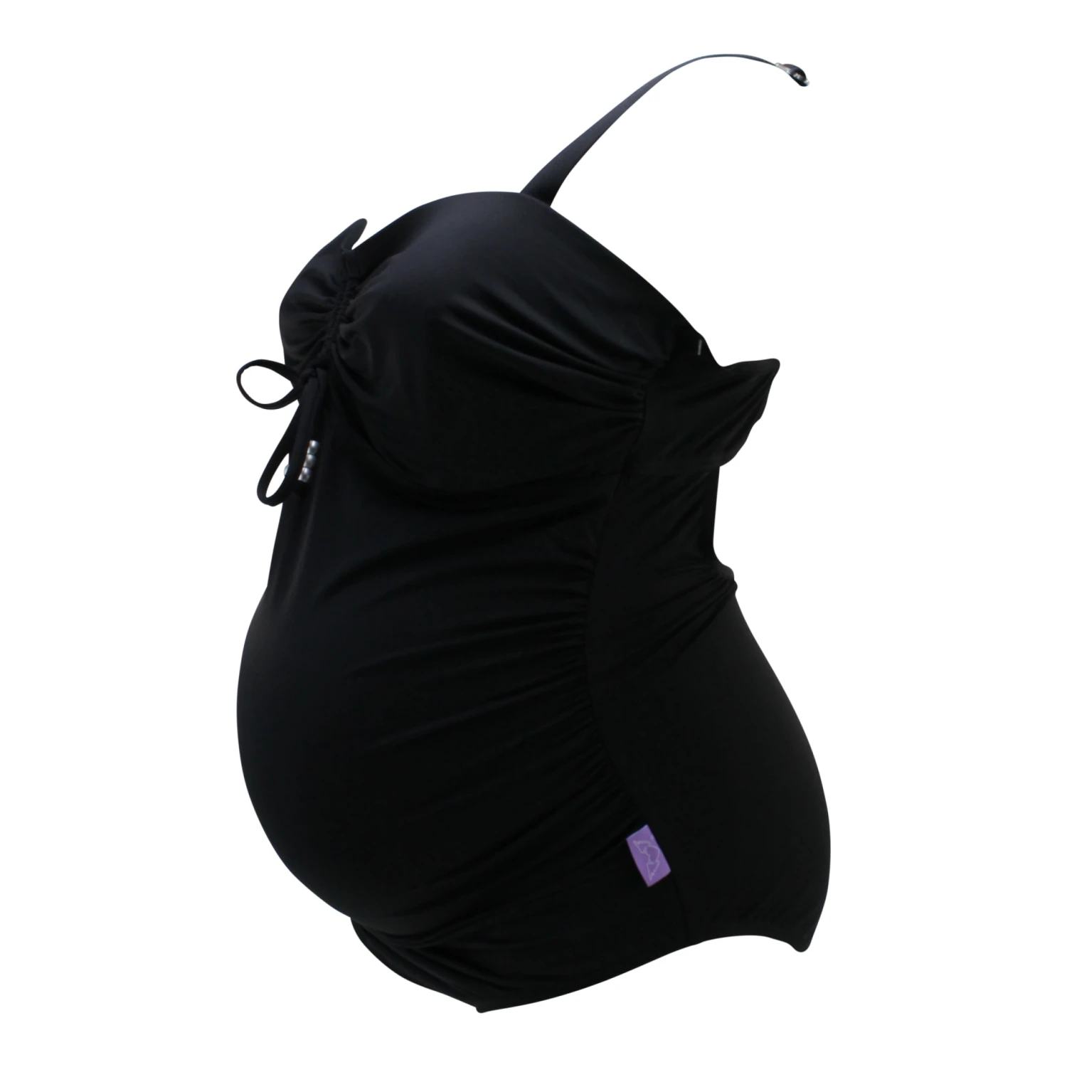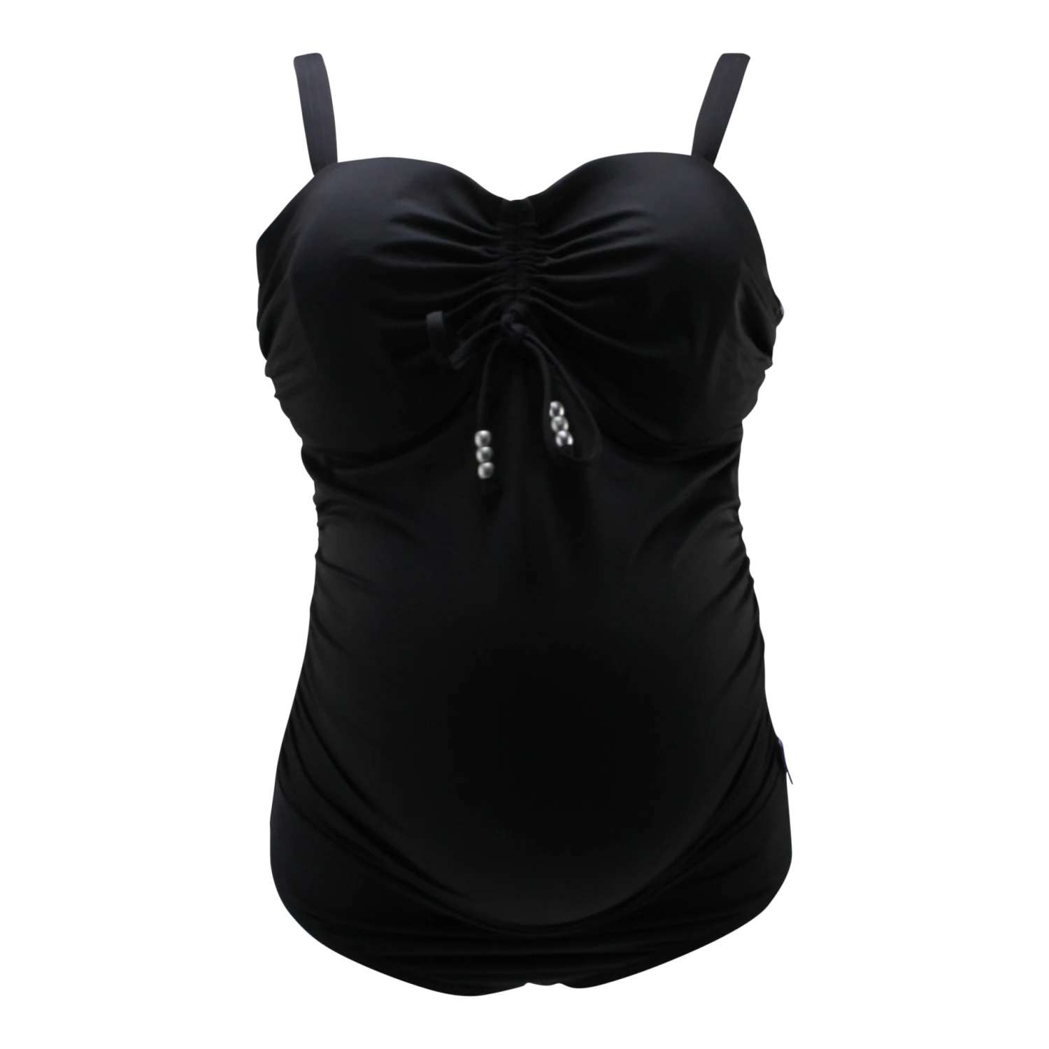 Die neue, seidig schimmernde Qualität unserer Umstandsbademode ist fein, weich, anschmiegsam und angenehm elastisch. Ein hochwertiges Silikontape liegt innen um die obere Kante des Umstandstankinioberteils und sorgt dafür, dass Nichts verrutscht. Die kunstvolle Raffung im Vorderteil ist individuell verstellbar durch den raffinierten Tunnelzug mit Bändchen. Der Rückenausschnitt ist tief und attraktiv und garantiert ein toller Hingucker.
