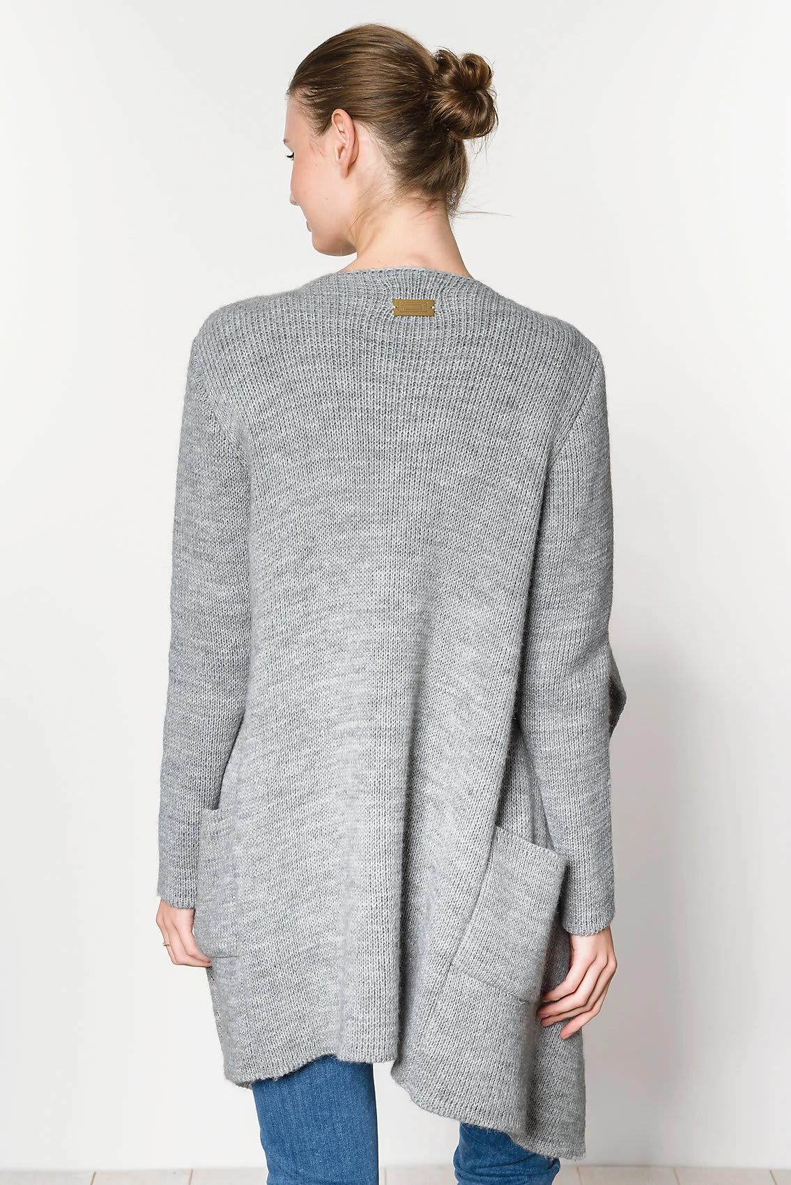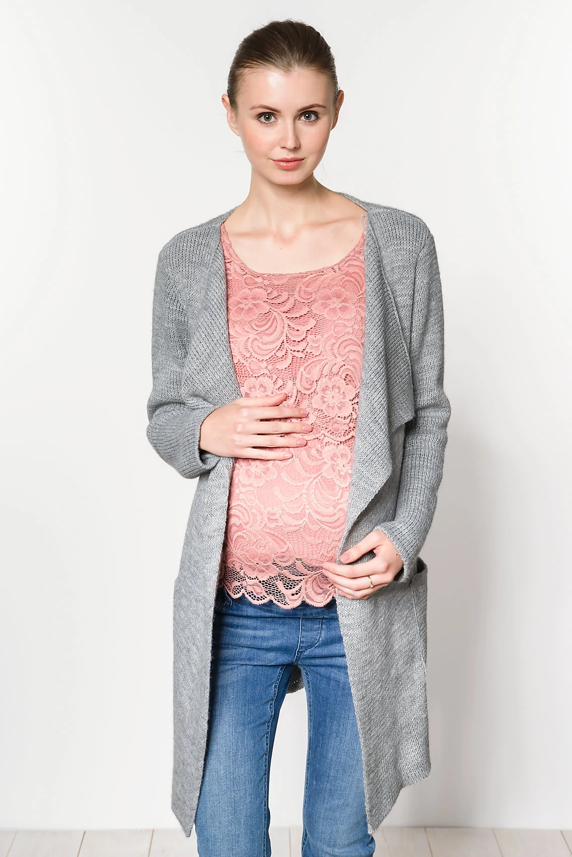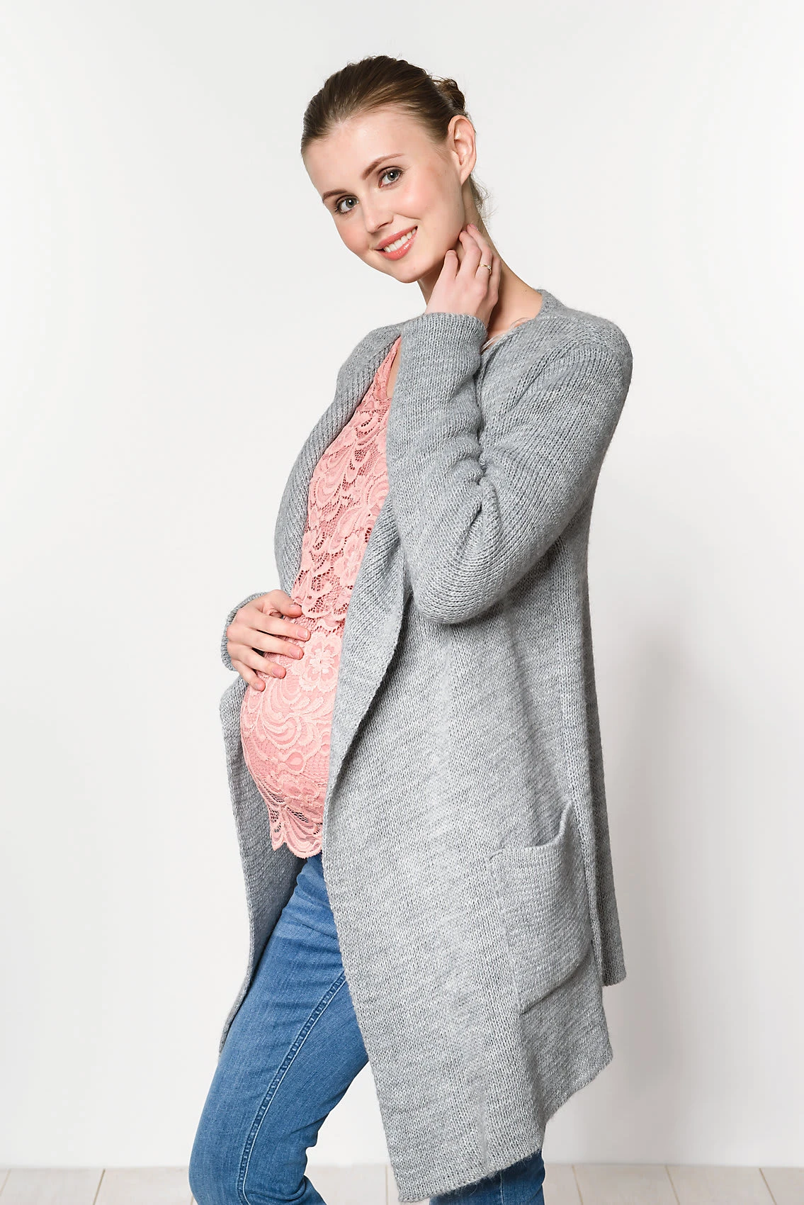 Die BEBEFIELD Umstandsstrickjacke Massimo besteht aus dichtem, wärmendem Strick. Das Modell wird offen getragen und kommt ohne Verschlüsse aus.