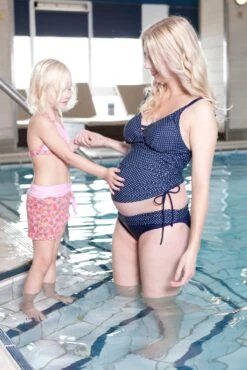 Dieser raffinierte Umstandstankini im maritimen Pünktchendruck auf navy-blau ist aus hochelastischer, weicher Qualität. Das Top macht durch die beiden Stege am Oberteil ein schönes Dekolletée und hat herausnehmbare, vorgeformte Polster und verstellbare Träger. Mit raffiniertem Tunnelzug in den Seitennähten ist das Bikinitop zum individuellen Raffen und Verstellen entwickelt worden. Der lässig geraffte Umschlag vom Bikinislip schmeichelt jeder Hüfte oder passt sich unter dem Babybauch formschön an. Die Cup-Größen sind passend für B-Cup, C-Cup bis D-Cup. Durch die Herausnahme des Polsters aus den Bikinioberteilen entsteht zusätzlich Volumen im Cup. Alle Modelle passen auch weit über die Schwangerschaft hinaus und freuen sich auch bei Niocht-Schwangeren immer größerer Beliebtheit: Durch die cleveren und sehr modernen Schnittkonstruktionen und das hochelastische Material kaschieren sie geschickt das eine oder andere Pölsterchen.